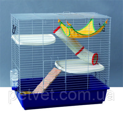 Клітка 647 з додатковими аксесуарами для ігор призначена для тхорів і шиншил. Виготовлена з металу з якісним пластиковим піддоном. Колір піддона можна підібрати під інтер'єр. Аксесуари (годівниця, поїлка, труби) виготовлені з якісного пластику.