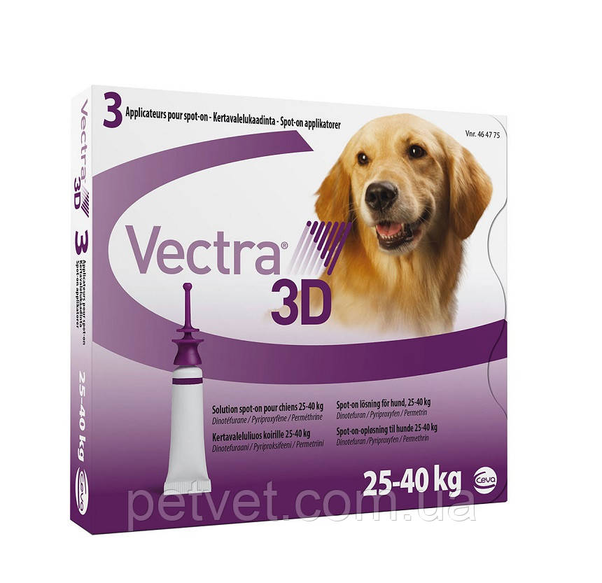Віктра 3Д (Vektra 3D) інсектоакарицидні краплі для собак вагою 25-40 кг. призначені для лікування та профілактики захворювань, викликаних ектопаразитами (блуки, воші, кліщі, власоїди, мухи, комарі). Основними активними речовинами є динотефуран, перметрин, пірипроксифен. Випускаються в піпетках по 6.4 мл. з подовженим наконечником для одноразового застосування. По 3 піпетки в пакованні.