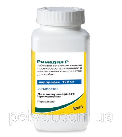 Римадил (Rimadyl) 100 мг, 20 табл. (аналог Рікарфа) зі смаком печінки є нестероїдним протизапальним і анальгетичним засобом для собак. Застосовується для лікування проблем опорно-рухового апарату та дегегенеративного захворювання суглобів у собак. Призначається в післяопераційний період як парентеральна аналогія, а також для зняття набряклості.Основною активною речовиною препарату Римадил є карпрофен — 100 мг в 1 таблетці. Допоміжні речовини: лактози моногідрат, крохмаль кукурудзяний, оксид заліза червоний, оксид заліза чорний, м'ясний ароматизатор, тальк, магнію стеарат.